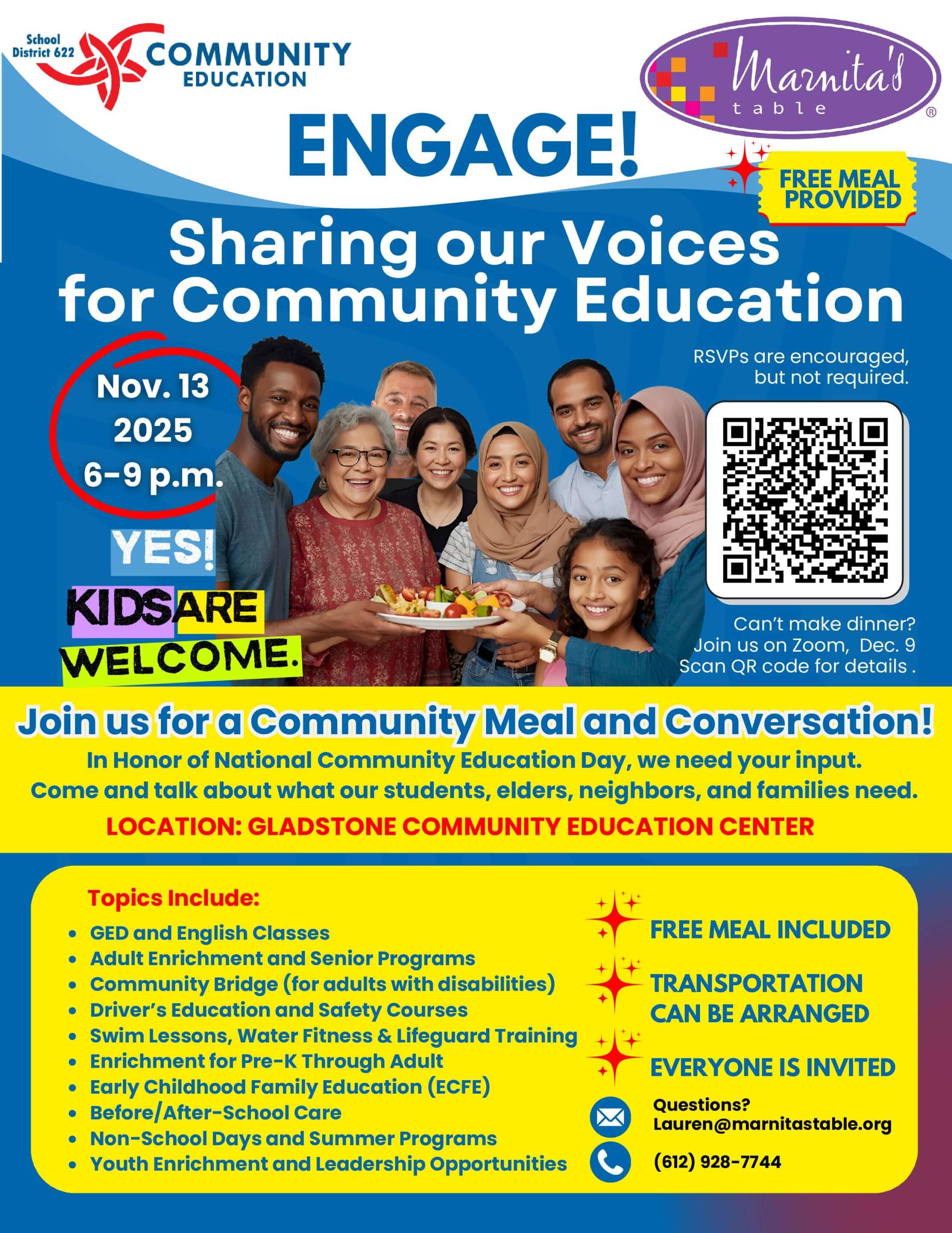 Please join us on Thursday, November 13 from 6:00 – 9:00 pm for Engage! Sharing our Voices for Community Education, a special opportunity to share a community meal and discuss what our students, elders, neighbors and families need to thrive as we celebrate National Community Education Day! You’ll learn more about educational offerings, extra-curricular activities and resources available through ISD 622 Community Education. Meet the team and share your voice for how to improve Community Education!
